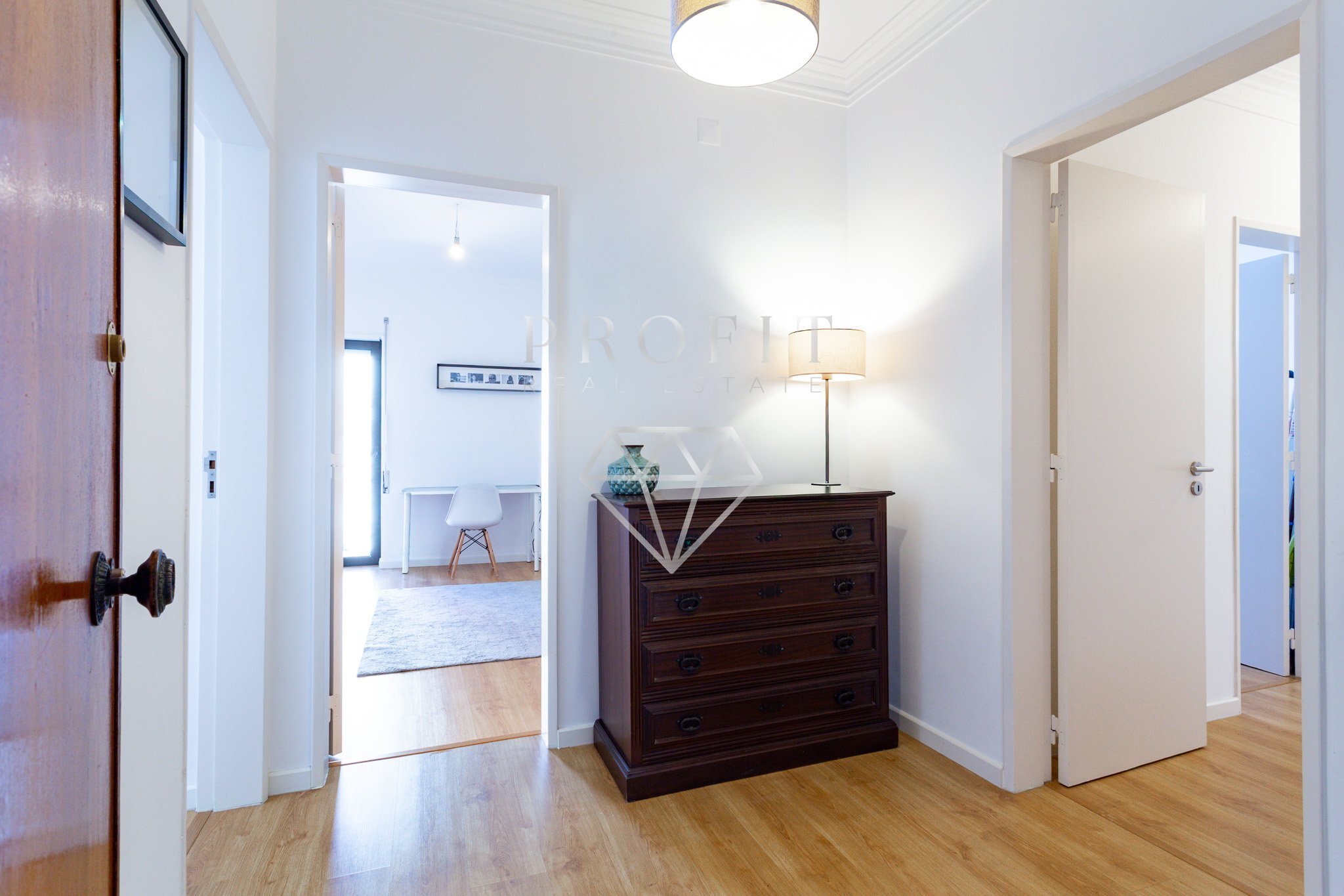 Apartamento composto por três quartos, um roupeiro no corredor dos quartos, cozinha equipada, duas casas de banho (uma completa e outra social) e uma varanda. Apartamento em excelente estado de conservação.